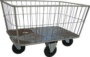 Выполнена из нержавеющей стали высокого качества в виде сетчатого короба и окантовкой в виде трубки для удобства эксплуатации. Тележка установлена на 4 колеса, диаметром 200 мм. Объем 490л