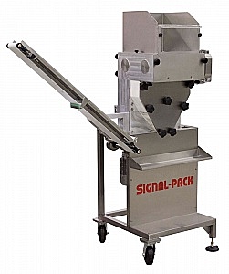Для передачи получаемой полосы к раскатным валкам пельменного автомата используется ленточный транспортер. Производительность устройства корректируется в автоматическом режиме, используя сигнал датчика полосы на входе в пельменный автомат.
