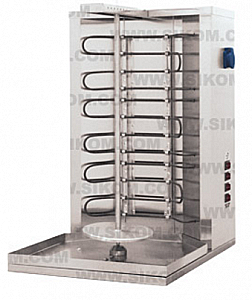 Гриль электрический с 1 вертикальным шампуром и ручным приводом предназначен для приготовления сирийского национального блюда "шаурма" в фаст-фудах, кафе и других небольших местах общественного питания. Загрузка - 30кг. Длина вертела 600мм.Гриль изготовлен из листовой нержавеющей стали и оснащен 2 ТЭНами (трубчатые электронагреватели), которые работают независимо друг от друга и могут быть отключены по мере надобности. На боковой поверхности гриля расположены органы управления, розетка и шнур питания. Принцип работы такого гриля заключается в воздействии инфракрасного излучения на продукт, которое генерируется нагревательными элементами, а равномерность прогрева и прожарки шаурмы достигается непрерывностью вращения вертела вокруг оси. Технология обжаривания мяса с использованием этого гриля для шаурмы предполагает нанизывание вырезки на нож, расположенный вертикально и вращающейся вокруг своей оси в непосредственной близости от нагревательных элементов, что позволяет добиться качественного прожаривания и исключить пригорания. Управление осуществляется с помощью механической панели, которая позволяет максимально регулировать температуру нагрева ТЭНов. Гриль оснащен специальным поддоном для сборки жира, вилкой для фиксации вертела и тарелкой для удерживания мяса.