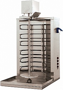 Гриль электрический с 1 вертикальным шампуром и электроприводом предназначен для приготовления сирийского национального блюда "шаурма" в фаст-фудах, кафе и других небольших местах общественного питания. Загрузка - 30кг. Длина вертела 600мм.Гриль изготовлен из листовой нержавеющей стали и оснащен 2 ТЭНами (трубчатые электронагреватели), которые работают независимо друг от друга и могут быть отключены по мере надобности. На боковой поверхности гриля расположены органы управления, розетка и шнур питания. Принцип работы такого гриля заключается в воздействии инфракрасного излучения на продукт, которое генерируется нагревательными элементами, а равномерность прогрева и прожарки шаурмы достигается непрерывностью вращения вертела вокруг оси. Технология обжаривания мяса с использованием этого гриля для шаурмы предполагает нанизывание вырезки на нож, расположенный вертикально и вращающейся вокруг своей оси в непосредственной близости от нагревательных элементов, что позволяет добиться качественного прожаривания и исключить пригорания. Управление осуществляется с помощью механической панели, которая позволяет максимально регулировать температуру нагрева ТЭНов. Гриль оснащен специальным поддоном для сборки жира, вилкой для фиксации вертела и тарелкой для удерживания мяса. Электропривод, обеспечивающий равномерное автоматическое вращение, устанавливается на верхнюю направляющую вертела. Скорость вращения вертела – 2 об/мин.