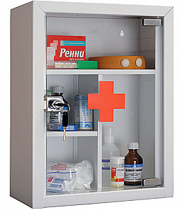Корпус аптечки изготовлен из тонколистового металла, дверца из стекла