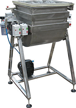 Крышка фаршемешалки выполнена из прозрачного оргстекла, что дает возможность визуально наблюдать за протеканием процесса перемешивания, закреплена на каркасе и оснащена устройством блокировки. Для выгрузки фарша конструктивно обеспечены легкое и удобное опрокидывание дежи, её фиксация в опрокинутом состоянии и возможность включения в этом положении мешалки для удаления остатков продукта. "Козловая" конструкция каркаса позволяет осуществлять выгрузку готового фарша непосредственно в стандартную чан-тележку (емкостью 100 литров), придвинутую к опрокинутой деже. Оснащена вакуумным насосом и вакууметром для контроля остаточного давления.