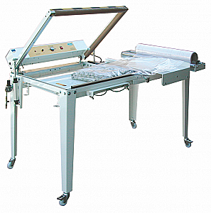 Машина упаковочная серии NIB мод. NIB (пневматическое управление). Стол упаковочный для химчисток и прачечных, предназначен для упаковки прямого белья, оснащён калёсами. Корпус машины выполнен из окрашенной стали, максимальный размер упаковки 70х70х50 см.