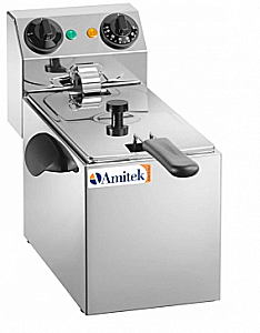 Корпус, ванна и крышка фритюрницы изготовлены из высококачественной нержавеющей стали, съемные корзины — из хромированной проволоки, ручки корзин и крышек — из термостойкого пластика.