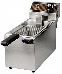 Фритюрница состоит из емкости, которая плотно накрывается крышкой, блока управления и технологической корзины. Прочная стальная корзина оборудована термоизолированной ручкой. Металлический крюк помогает зафиксировать корзину над емкостью с маслом в верхнем положении. Встроенные индикаторы питания и нагрева позволяют контролировать процесс приготовления. В случае перегрева срабатывает система безопасности и аппарат автоматически отключается.