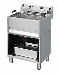 Электрическая фритюрница с краном для слива. Корпус и тэны из нержавеющей стали, холодная зона, рабочие и защитные термостаты, регулировка температуры 50-190° С, с краном для слива, подставка из нержавеющей стали по требованию.
