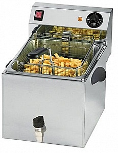 Корпус фритюрницы из нержавеющей стали с ручками и крышкой, ванна из нержавеющей стали, со съемной торцевой частью, защитный микровыключатель, защитный термостат и термостат для регулировки температуры, выключатель пуск/остановка.