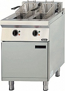 Фритюрница с двумя баками (объемом 10-литров каждый). Нагревательные элементы помещены в бак и могут быть подняты для легкой очистки. Баки выполнены с независимыми рабочими термостатами.