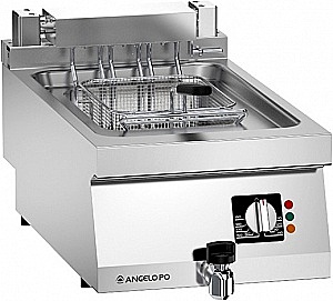 Фритюрница изготовлена из нержавеющей стали AISI 304, толщина поверхности 20/10 мм. Спрессованная емкость, плотно прилегает к поверхности, имеет большую зону слива; поставляется с 1 корзиной и 1 крышкой. Механическое управление. Регулировка температуры осуществляется с помощью термостата на 100-190°C. Наклонные нагревательные элементы в емкости.