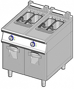 Фритюрница электрическая с электромеханическим управлением, на закрытом стенде с 2 дверцами, с 2 ваннами вместимостью 18л каждая изготовлена из нержавеющей стали AISI304 с покрытием Scotch Brite. Высота столешницы - 60мм. Фритюрница оснащена штампованной ванной с закругленными углами с широкой холодной зоной для сбора остатков продуктов; термостатом; полкой-решёткой и поддоном для сбора отслоившихся кусочков готовящегося продукта. В комплекте 4 корзины (арт.270205630) размером 145х285х100мм каждая. Регулировка температуры +100/+180С осуществляется с помощью термостата. Размер каждой ванны 307x342х335мм. Дверцы стенда имеет магнитную защёлку. Благодаря закругленным углам и специальной системе, которая предотвращает просачивание жидкости, значительно упрощается чистка оборудования. Все функциональные элементы вынесены на переднюю панель. Ножки из нержавеющей стали регулируются по высоте. Оборудование серии 9001 может использоваться как независимо, так и в составе линии приготовления.