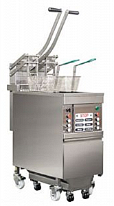 Фритюрница электрическая на закрытом стенде с одной ванной объёмом 29л. Оснащена автоматическим механизмом поднятия корзин и ручным механизмом поднятия тэнов. Имеет холодную зону 1.7 л. для сгоревших частичек продуктов. Фритюрница имеет 6 программ со звуковым сигналом и световой индикацией выбранной программы. Блок управления расположен на фронтальной части фритюрницы и закрыт съёмной панелью с рамкой-держателем для сменной таблички с названием программ. Мощность 14кВт. Напряжение 380V.