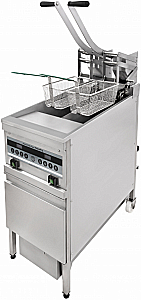 Фритюрница электрическая с системой фильтрации масла на закрытом стенде с двумя ваннами объёмом по 12л каждая. В комплекте две корзины из нержавеющей стали. В комплекте с фритюрницей поставляются 10 фильтров. Ключевые особенности: 1) Две ванны объёмом по 12л каждая в сочетании с мощными ТЭНами – позволяют качественно готовить большие объемы замороженной продукции. При загрузке целой корзины, например, картофеля фри – температура масла у фритюрниц со слабыми ТЭНами и маленькой ванной может падать до 100*С и ниже. В результате страдает качество, так как происходит не жарка, а варка картофеля. Мощные ТЭНы фритюрницы Robofry быстро возвращают температуру масла на заданный уровень, обеспечивая возможность работать в режиме нон-стоп. 2) Встроенная система фильтрации – простой и надежный механизм позволяет фильтровать в течение дня, практически не прерывая работу аппарата. Цикл фильтрации длится около 5 минут. При регулярной фильтрации масла можно продлить срок его жизни в 2 раза, тем самым значительно сэкономив, ведь не секрет, что расходы на масло – одна из самых крупных статей в бюджете точки фаст-фуда. 3) Контроллер RoboLabs позволяет максимально гибко настраивать режим работы фритюрницы, переключать фритюрницу в режим ожидания в периоды простоя и затем быстро выводить на рабочий режим. Данная опция способна значительно уменьшить интенсивность окисления масла. Кроме того, можно установить периодичность фильтрации масла и записать до 4 программ на каждую корзину. 4) Холодная зона – один из главных признаков того, что перед вами настоящий профессиональный фритюр для фаст-фуда. Это пространство под ТЭНами фритюрницы, где температура масла не превышает 100*С, благодаря чему оседающие на дне частички продукта не горят и не портят масло. 5) Ручной механизм поднятия ТЭНов – значительно упрощает регулярную мойку фритюрницы. 6) Механизм поднятия корзин - гарантирует соблюдение установленных режимов приготовления, освобождает персонал от постоянного контроля за фритюрницей, так как лифты самостоятельно поднимают корзину из ванны через установленное время.