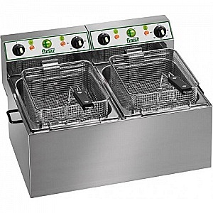 Фритюрница FT88, 2-е емкости / ванны 8 + 8 литров, почасовое производство 8 кг + 8 кг, время обжаривания около 5 минут. Фритюрница электрическая настольная предназначена для приготовления продуктов в большом количестве жира. Корпус, ванна и крышка из нержавеющей стали, выдвижные корзины из хромированной проволоки, ручки корзин и крышек из термоизолирующего пластика, ТЭНы из нержавеющей стали, термостат 50:180 ° C, предохранительный термостат с кнопкой возврата в исходное состояние, в исполнении с двумя ваннами с двойным термостатом для независимого использования, съемные верхний блок и ТЭНы.