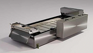 Во входной зоне расположен загрузочный лоток с перфорацией для удаления излишков как панировки, так и мелких частичек, отделившихся от продукта.