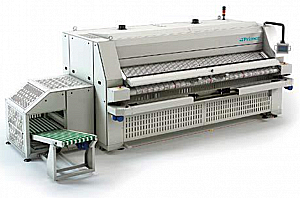Гладильная машина (каландр), которая сушит, гладит, складывает белье и укладывает в стопки.