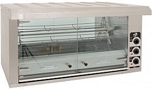 Гриль для кур электрический карусельный с электромеханической панелью управления, 1 камерой с загрузкой 16 кур весом до 2кг изготовлен из нержавеющей стали и оснащен просторными люльками для размещения продукта, мощным двигателем, таймером. Съемные отражатели значительно облегчают уборку гриля и очистку труднодоступных мест, способствуют уменьшению задымленности при работе и улучшению санитарного состояния. Простая надежная панель управления справа позволит легко управлять процессом жарки, а таймер напомнит об окончании приготовления. Современные высококачественные ТЭНы с высокой температурой рабочей поверхности позволяют получать качественный равномерный «загар» куриц. Самоочищающаяся зубчатая муфта облегчает установку вертела, устраняет люфт при неравномерной загрузке и значительно продлевает срок службы электродвигателя. Сливная пробка позволяет опорожнять поддон, не вынимая его и не останавливая процесс приготовления, существенно повышает комфортность и безопасность обслуживания. Лампы подсветки, вынесенные за пределы зоны нагрева, значительно улучшают освещенность не только рабочей камеры, но и рабочей зоны, повышают безопасность эксплуатации. Новая люлька длиннее и глубже, что облегчает загрузку куриц. Подвес новой конструкции исключает случайное падение люльки. В гриле карусельного типа в объеме рабочей камеры по замкнутой траектории вращаются съемные корзинки (люльки) с уложенными в них птицами. Вращение корзин осуществляется электродвигателем. Гриль удобен в эксплуатации: куры легко закладываются и извлекаются из люлек, без повреждений, а также можно приготовить не только крупных птиц, но и отдельные части: крылышки, бедрышки, грудки. В комплекте 4 люльки-корзины. Дополнительно можно приобрести подставку Т-8.16. Оригинальная конструкция крыши с подсветкой, спрятанной в козырьке, равномерно освещает весь рабочий объем и делает процесс приготовления более привлекательным.