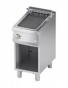 Нагревательные элементы имеют защитную оболочку из нержавеющей стали AISI 304. Тепловая нагрузка резисторов такова, что теплообмен осуществляется только по направлению к пище, что улучшает приготовление пищи и экономит энергию. Съемный водосборный бак из AISI 304 с холодным формованием и дренажным отверстием. Вода улучшает качество приготовленных блюд и отводит жиры в канализацию.