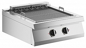 Электрический гриль, две зоны приготовления пищи. Верхняя часть из нержавеющей стали (AISI 304) толщиной 20/10, предварительно установлена для соединения «голова к голове». Решетка из чугуна, поворачивающаяся. Наклон вперед для приготовления жирного мяса, с элементами толщиной 4 мм в прямом контакте и поддоном для сбора жира. Горизонтальная решетка для рыбы и овощей, элементы с круглым дизайном диаметром 10 мм. Защита от брызг с трех сторон, высота 13,5 см, из нержавеющей стали AISI 304. Канал для слива жира спереди, легко снимается для очистки. Съемный поддон для жира и воды, расположенный под нагревательными элементами. Жир охлаждается водой. Затем вода испаряется и бережно готовит пищу. Блок управления расположен на неподвижной передней панели. Нагрев с помощью экранированных электрических сопротивлений из инколоя, расположенных под решеткой для приготовления пищи, защищенных диффузором из нержавеющей стали (AISI 316), легко снимаемым для очистки. Активация и настройка процесса нагрева с помощью термостата. Оранжевый сигнальный индикатор загорается, когда прибор включен и работает. Регулируемые по высоте ножки из нержавеющей стали. Скребок для решетки входит в комплект.