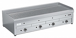 Гриль газовый настольный из нержавеющей стали. 4 мощные горелки нагревают лавовые камни. Капли жира, попадая на раскаленные камни, образуют лёгкий дымок, придающий мясу неповторимый вкус. Добавив на камни немного древесной стружки, вы получите продукт с ароматом копчения. Специальная V-образная решетка задерживает излишки жира, выделяющиеся при жарке. Лавовые камни долго держат тепло, позволяя готовить большое количество блюд. Газконтроль, запальная горелка, пьезоподжиг каждой зоны, поддон для сбора жира, работа на природном или сжиженном газе.