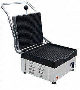 Верхняя откидная ребристая (268х242 мм) и нижняя ребристая (300х300 мм) пластины из сплава чугуна обеспечат быстрое и равномерное приготовление за счет нагрева продукта с обеих сторон.