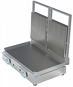 Корпус гриля выполнен из пищевой нержавеющей стали. Жарочные поверхности выполнены из углеродистой стали и представляют собой две независимые верхние поверхности и одну общую нижнюю. Верхние поверхности рифленые, а нижняя - гладкая. Размер жарочных поверхностей: нижняя – 510х280 мм, каждая верхняя поверхность – 250х220 мм. Установлено по одному терморегулятору на каждую половину жарочной поверхности, что позволяет независимо регулировать температуру на каждой половине гриля в пределах от 0 до + 275 °С, нагрев осуществляется ТЭНами, расположенными в верхней и нижней поверхностях. С передней стороны по всей длине жарочной поверхности установлен съемный поддон для сбора излишков жира. Давление верхних рабочих поверхностей регулируется прижимной пружиной, что обеспечивает адаптацию к различной толщине продукта. Комплектуется скребком для легкой очистки рабочих поверхностей.