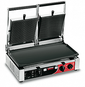 2 регулируемых термостата до 300 °C., которые позволяют использовать отдельно две половины гриля
