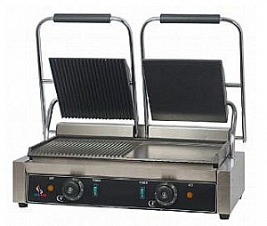 Прижимной гриль Airhot DCG-FFG предназначен для жарки мяса, птицы, рыбы, овощей, а также для приготовления стейков, гамбургеров и горячих сэндвичей на предприятиях общественного питания и торговли. Высокая скорость приготовления достигается благодаря встроенным в обе части аппарата тепловым элементам, которые плотно прилегают к продукту. Модель оснащена терморегулятором и съёмным поддоном для сбора жира и крошек. Корпус выполнен из нержавеющей стали, жарочная поверхность - из чугуна с антипригарным покрытием.