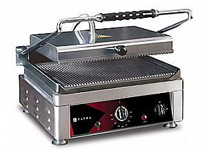 Контактный гриль оснащен электромеханической панелью управления с выключателем питания, терморегулятором и индикаторами питания и нагрева. Температурный диапазон оборудования 50-300°C. Оптимальная температура использования 200-250°C. Время разогрева до рабочей температуры составляет около 15 минут.