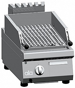 Литая рабочая поверхность из нержавеющей стали наклонена к сливу жира, который соединен с большим погружным лотком под поверхностью варочной поверхности. Оснащен ящиком для отвода жира.