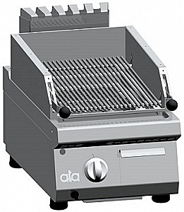 Литая рабочая поверхность из нержавеющей стали наклонена к сливу жира, который соединен с большим погружным лотком под поверхностью варочной поверхности. Оснащен ящиком для отвода жира.