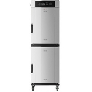 Печь-коптильня низкотемпературного приготовления двухкамерная передвижная с 2 глухими правыми дверями, системой Halo Heat обеспечивает равномерный нагрев продуктов и предназначена для приготовления, хранения и копчения продукции. Размер 1 камеры - 479x673x683мм. Вместимость 1 камеры - макс.54кг; 7GN1/1-65мм или 14GN1/2-65мм (на полках-решётках). Гастроемкости в комплект не входят. Печь не гастронормированна, установка гастроёмкостей ТОЛЬКО на полках-решётках, для макс.вместимости необходимо приобрести дополнительные полки-решётки. Объём 1 камеры – макс.56,8л. Рабочая температура: приготовление от +94С до +163С, хранение от +29С до +96С. Печь оснащена программируемой панелью управления Simple, 2х2 стальными боковыми рамами с 15 уровнями с шагом 36мм, 2х3 стальными полками-решетками, съемным внешним жиросборником со сливным отверстием, контейнером для щепы, пакетом со щепой, одноточечным съёмным датчиком-термощупом. Оборудование готовит по времени или с помощью датчика-термощупа, который измеряет температуру в готовящемся продукте. По достижении заданных параметров печь автоматически перейдет из режима приготовления в режим хранения. Печь не требует подключения к вытяжной системе. Корпус и рабочая камера изготовлены из нержавеющей стали. Печь оснащена 4 колесами: 2 шарнирных с тормозом и 2 жестко закрепленных. Диаметр колес - 64мм. Конструкция печи предусматривает равномерное распределение электрического термального кабеля по всей камере. Таким образом, создается тепло, которое окружает продукт одинаковой температурой при неподвижном воздухе камеры. Этот запатентованный метод низкотемпературного приготовления сохраняет естественную влажность продукта и при этом исключает использование иссушающих вентиляторов для распределения тепла и емкостей для пароувлажнения, чтобы компенсировать иссушающий эффект вентиляторов.
