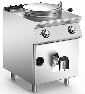 Котел пищеварочный неопрокидывающийся с прямым газовым нагревом из нержавеющей стали AISI 304. Верх 15/10 толщиной AISI 304 нержавеющей стали. Низ полированная нержавеющая сталь AISI 316L, стены из нержавеющей стали AISI 304. Объем 50 литров. Заполнение горячей или холодной водой через электромагнитный клапан приводится в действие выключателем. Кран фиксированный, расположен сверху. 1 1/2 безопасный сливной кран с ручкой.