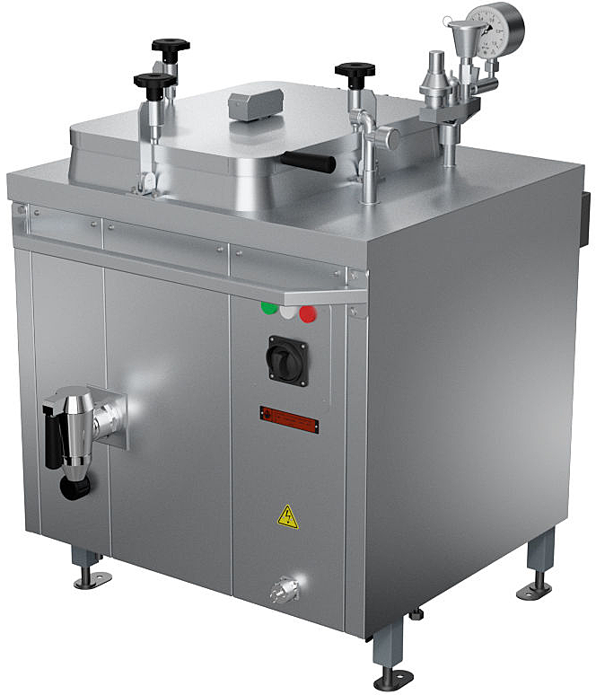 Конструктивной особенностью данных котлов является наличие двойной герметичной крышки. Одна крышка – прямоугольная, с накидными рычагами - служит для санитарной обработки, а также для загрузки продуктов в варочный сосуд. В верхней части прямоугольной крышки расположена горловина с дополнительной малой круглой крышкой, которая также является герметичной и на ней расположен перепускной клапан для сброса давления внутри емкости. Данная конструкция крышки котлов позволяет пользоваться изделием непосредственно через малую крышку, что особенно необходимо в период крена судна, качки, предотвращая тем самым выплескивание.