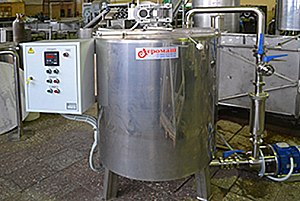"Сироповарочный котел 80 л. Емкость трехслойная из пищевой нержавеющей стали AISI304 (08Х18Н10) с термоизоляцией, с коническим дном, на сливе «грибковая пробка», нержавеющий кран Ду50. Первый слой — колба продукта, второй - рубашка под глицерин с ТЭНами мощностью, соответствующей объёму (время нагрева до 100°С — в среднем 20 минут), третий слой — теплоизоляция минеральной ватой с внешней рубашкой из нержавеющей стали. 1/3 крышки подъемная, датчики ТСП (платиновые) в продукт и в рубашку до 290°С, моющая головка. Перемешивающее устройство рамного типа с фторопластовыми скребками 28-35 об/мин. Пеногаситель. Пульт управления, включая 2-х канальный измеритель-регулятор для автоматического поддержания температуры, пускатель перемешивающего устройства и ТЭНов. Опоры из ст.3, высота по ТЗ Заказчика.
