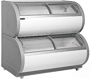Модель оснащена 2 уровнями морозильных камер, 4 гнутыми раздвижными дверьми, 10 корзинами, 4 колесами и замком. Двери выполнены из закаленного стекла.