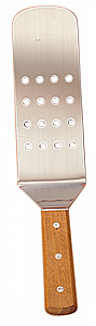 Срвировочная лопатка с перфорированным лезвием с закругленными углами из нержавеющей стали и деревянной ручкой.