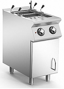 Макароноварка электрическая с одной ванной объемом 28 литров из нержавеющей стали AISI 304. Ванна из AISI 316 полированной нержавеющей стали с закругленной нижней частью для простоты очистки. Загрузка воды через электромагнитный клапан активируется переключателем на панели управления. Быстрое наполнение. Нагрев прекращается, если ванна пуста. Поворотный кран расположен на задней панели. Точный контроль нагрева с помощью регулятора энергии. Активация нагрева сигнализируется индикатором выводится на панели управления. Размеры ванны: 310x340x275 мм, сливной кран установлен снаружи на передней панели. Регулируемая по высоте ножки из нержавеющей стали. Крышки и корзины в комплект не входят.