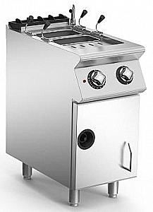 Макароноварка газовая с одной ванной объемом 28 литров из нержавеющей стали AISI 304. Ванна из AISI 316 полированной нержавеющей стали с закругленной нижней частью для простоты очистки. Загрузка воды через электромагнитный клапан активируется переключателем на панели управления. Быстрое наполнение. Нагрев прекращается, если ванна пуста. Поворотный кран расположен на задней панели. Газоснабжение контролируется предохранительным клапаном с термоэлементом, электрическое автоматическое зажигание. Точный контроль нагрева с помощью регулятора энергии. Активация нагрева сигнализируется индикатором выводится на панели управления. Размеры ванны: 310x340x275 мм, сливной кран установлен снаружи на передней панели. Регулируемая по высоте ножки из нержавеющей стали. Крышки и корзины в комплект не входят.