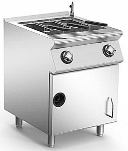 Макароноварка газовая с одной ванной объемом 42 литров из нержавеющей стали AISI 304. Ванна из AISI 316 полированной нержавеющей стали с закругленной нижней частью для простоты очистки. Загрузка воды через электромагнитный клапан активируется переключателем на панели управления. Быстрое наполнение. Нагрев прекращается, если ванна пуста. Поворотный кран расположен на задней панели. Газоснабжение контролируется предохранительным клапаном с термоэлементом, электрическое автоматическое зажигание. Точный контроль нагрева с помощью регулятора энергии. Активация нагрева сигнализируется индикатором выводится на панели управления. Размеры ванны: 510x310x275 мм, сливной кран установлен снаружи на передней панели. Регулируемая по высоте ножки из нержавеющей стали. Крышки и корзины в комплект не входят.