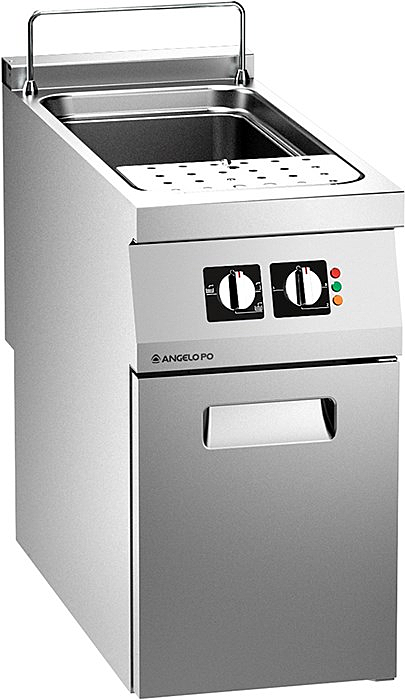 Макароноварка изготовлена из нержавеющей стали AISI 304, толщиной поверхности 20/10 мм. Гермитичная ванна из полированной нержавеющей стали AISI 316L. Прямой нагрев осуществляется с помощью нагревательных элементов, встроенных в ванну макароноварки, контролируются 5-ти позиционным переключателем. Переднее дренажное отверстие перелива. Дренажный слив из нержавеющей стали, находится на передней части панели. Наполнение водой осуществляется через кран на верхней части макароноварки, ручным управлением с помощью ручки на панели управления. Не оборудована корзинами. Возможно подключение к специальной системе дистанционного управления пиками мощности.