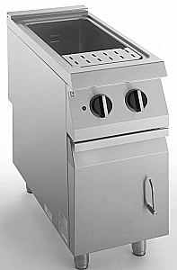 Электрическая макароноварка, одинарная ячейка, на закрытом шкафу. Варочная панель из прессованной нержавеющей стали (AISI 304), толщина столешницы 20/10, с поддоном для сбора жидкости и широкой зоной расширения пены, предварительно приспособлена для прямого соединения. Колодец из прессованной нержавеющей стали (AISI 316), отполированный, с закругленными углами для легкой очистки. Вода загружается через электрический клапан, активируемый переключателем на панели управления. Возможность быстрого заполнения и пополнения. Реле давления предотвращает нагрев, если колодец пуст. Стационарный водопроводный кран из нержавеющей стали, расположенный под поддоном для сбора капель. Нагрев с помощью экранированных электрических сопротивлений, расположенных внутри колодца для повышения производительности, а механизм наклона облегчает очистку колодца. Нагрев контролируется с помощью регулятора мощности, чтобы сделать процесс кипячения более эффективным. Оборудован предохранительным термостатом с ручным перезапуском. Объём 42 л. Размеры колодца в см. 30,5х51х28,5ч. Слив воды осуществляется через ручку, расположенную на базовом блоке. Регулируемые по высоте ножки из нержавеющей стали.