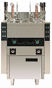 Макароноварка (паста-бойлер) напольная с автоматическим опусканием и подниманием 6 порционных корзин диаметром 140 мм и глубиной 180 мм с термоизолированными ручками и зацепами. Объем емкости для отваривания 60 л. Необходимо подключение к водопроводу и канализации. Раздельное включение правого и левого ТЭНа и левого и правого ряда корзин. Программирование времени приготовления для каждой корзины с точность до 1 секунды. Простой контроллер времени для каждой корзины с индикацией выбранного интервала времени, времени, оставшегося до окончания приготовления. Начало цикла приготовления путем механического нажатия на кнопку-заглушку штыря на котором размещена корзина. Акустический сигнал по окончании цикла приготовления. Кран, регулирующий подачу воды в основную емкость во фронтальной панели. Термоизолированная емкость паста-бойлера. При подъеме всех корзин температура воды снижается до +96 Градусов. Влагозащищенное исполнение всех электрических и механических компонентов класса IP 64.