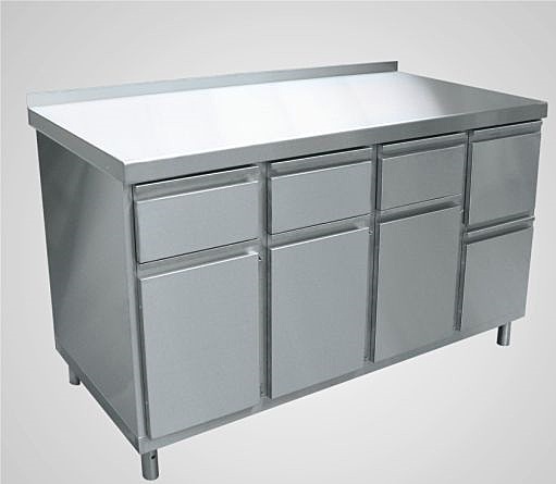 Предназначен для хранения чашек, тарелок, столовых приборов, а также продуктов питания в индивидуальной упаковке, таких как макаронные изделия и крупы. Состоит из четырех шкафчиков с распашными дверями, трех выдвижных ящиков и одного опрокидывающегося ящика для хранения зерен. Все детали стола для кофе-машины Abat СКМ-7-2 изготовлены из нержавеющей стали. Ножки с резиновыми вставками для удобства регулируются по высоте.Допускаемая нагрузка на столешницу: 100 кг. Допускаемая нагрузка на полку: 36 кг. Допускаемая нагрузка на один выдвижной ящик: 5 кг. Допустимая нагрузка на откидной ящик: 2 кг. Количество выдвижных ящиков: 3 шт. Количество откидных ящиков: 1 шт. Габаритные размеры ящика: 300х520х150 мм.