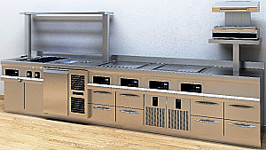 Держатель ложек установлен на моноблочной варочной поверхности. Конструкция из нержавеющей стали AISI 304. Оборудована загрузкой горячей воды, сливом и съемным поддоном. можно мыть в посудомоечной машине