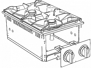 Газовая варочная поверхность из нержавеющей стали AISI 304. Верхняя часть 15/10 без отверстий для дымохода. Устройство состоит из 2 горелок, герметично соединенных с верхней частью, с максимальной мощностью 6 кВт. Предохранительный кран с термопарой для непрерывного регулирования мощности от 1,6 до 6 кВт. Розжиг основной горелки с помощью постоянной низкоэнергетической пилотной горелки (170 Вт). Пилотная горелка и термопара расположены под корпусом основной горелки, защищены от случайных ударов и проливов. Верхняя часть имеет закругленные углы для удобства очистки и подставки для кастрюль из эмалированного чугуна RAAF (устойчив к кислотам, щелочам и пламени). С блоком управления.