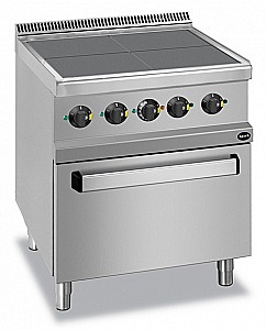 Электрическая плита с четырьмя низкими прямоугольными конфорками и статическим жарочным шкафом. Размер конфорок 300х300 мм, мощность каждой из них составляет 3 кВт. Конфорки изготовлены из высококачественного чугуна. Рабочая поверхность плита оснащена выдвижным поддоном для сбора остатков пищи. Статический жарочный шкаф на 3 уровня подходит для работы с гастроемкостями GN 2/1, размер рабочей камеры – 560х660х310 мм. Корпус оборудования и стенки жарочного шкафа выполнены из нержавеющей стали AISI 304 толщиной 1 мм.