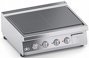 Толстая плита из нержавеющей стали с закругленными краями. Четыре разных зоны приготовления, каждая из которых снабжена реле давления, что позволяет варьировать тепловую мощность от максимума до минимума.