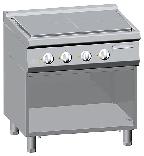 Толстая плита из нержавеющей стали с закругленными краями. Четыре разных зоны приготовления, каждая из которых снабжена реле давления, что позволяет варьировать тепловую мощность от максимума до минимума.