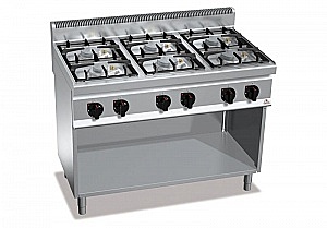 Рабочая поверхность и фронтальные панели из нержавеющей стали AISI 304. Горелки полностью из чугуна, с пожизненной гарантией, включающиеся с помощью оснащенного клапаном крана и герметично закрепленные на поверхности из стали AISI 304 глубокой штамповки. Предохранительная термопара. Плита снащена пилотным огнем, защищенным латунной крышкой, легко чистятся и обслуживаются. Регулируемые ножки.