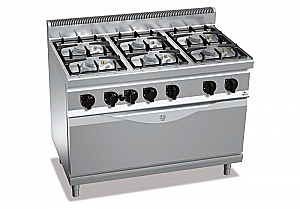 Рабочая поверхность и фронтальные панели из нержавеющей стали AISI 304. Горелки полностью из чугуна, с пожизненной гарантией, включающиеся с помощью оснащенного клапаном крана и герметично закрепленные на поверхности из стали AISI 304 глубокой штамповки. Предохранительная термопара. Плита оснащена пилотным огнем, защищенным латунной крышкой, легко чистится и обслуживается. Духовой шкаф с горелкой со самостабилизирующимся огнем, расположенной под рифленым стальным дном, с термостатом, регулирующим температуру в диапазоне от 160° до 280° C. Духовой шкаф из нержавеющей стали с направляющими на 4 уровнях. Дверь и контрдверь из нержавеющей стали AISI 304. Ручка двери из высокопрочной стали AISI 304 толщиной 20/10. Регулируемые ножки. Стандарт: Пьезоэлектрический поджиг печи, 1 противоопрокидывающийся гриль печи.
